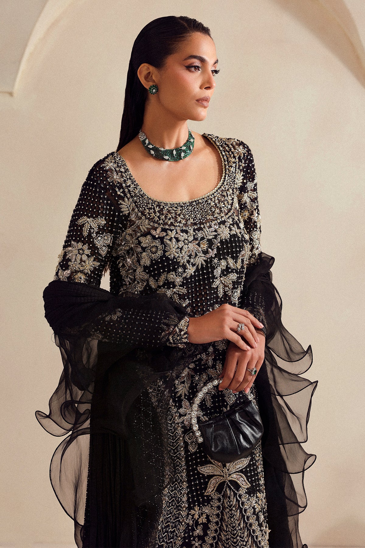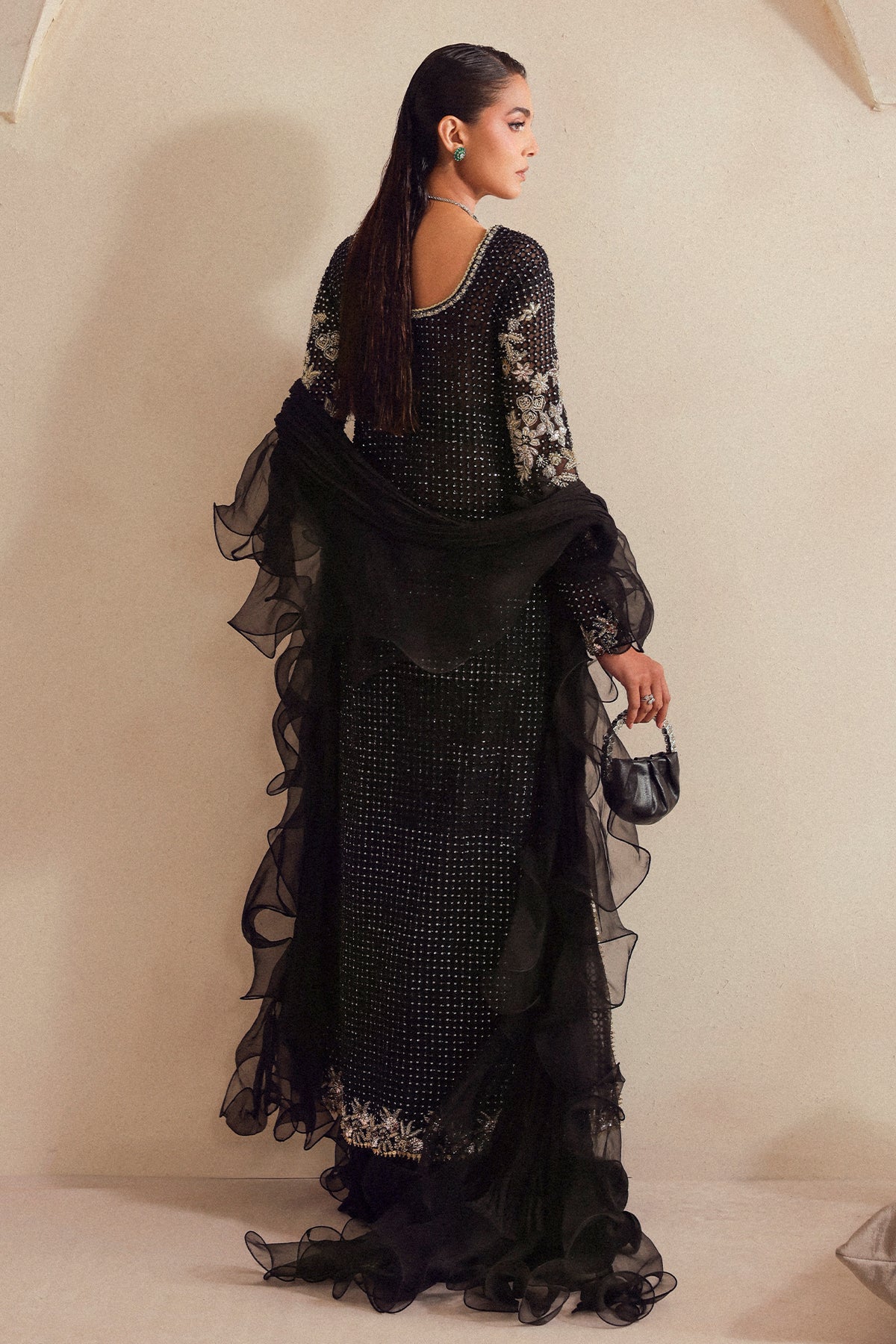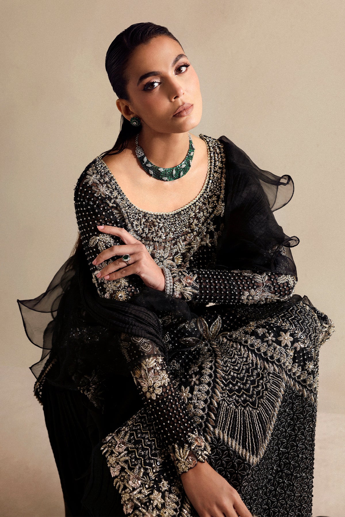A classic black straight-cut shirt crafted for a clean and structured silhouette, paired with crushed raw silk trousers that add texture and understated depth. The contrast between the sharp tailoring and the rich fabric creates a powerful yet elegant look, perfect for formal evenings and statement festive wear with a modern edge.