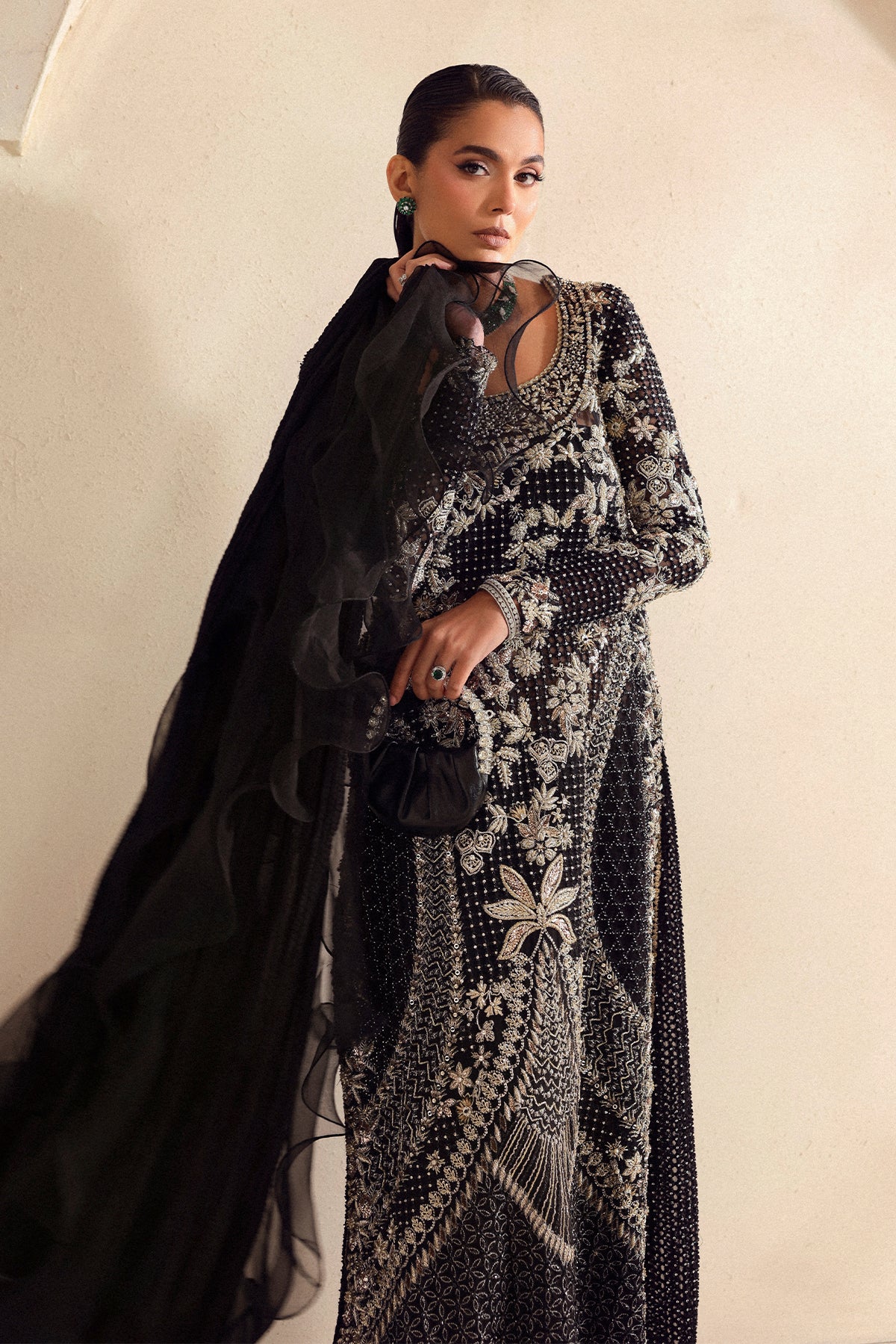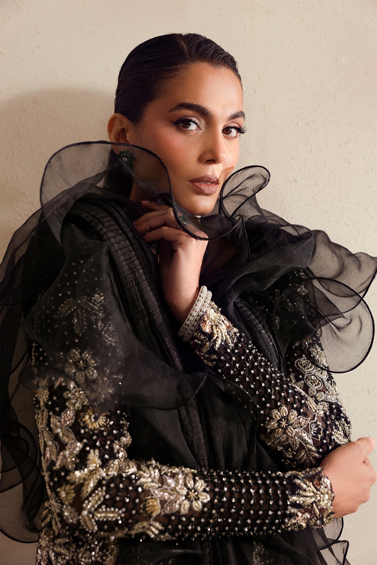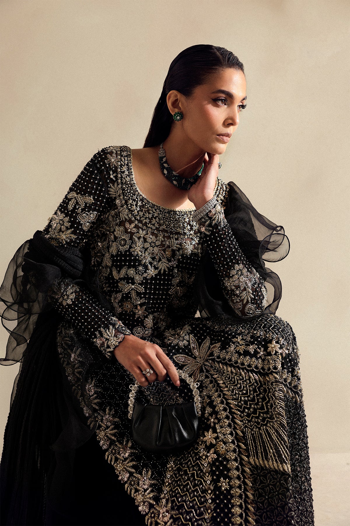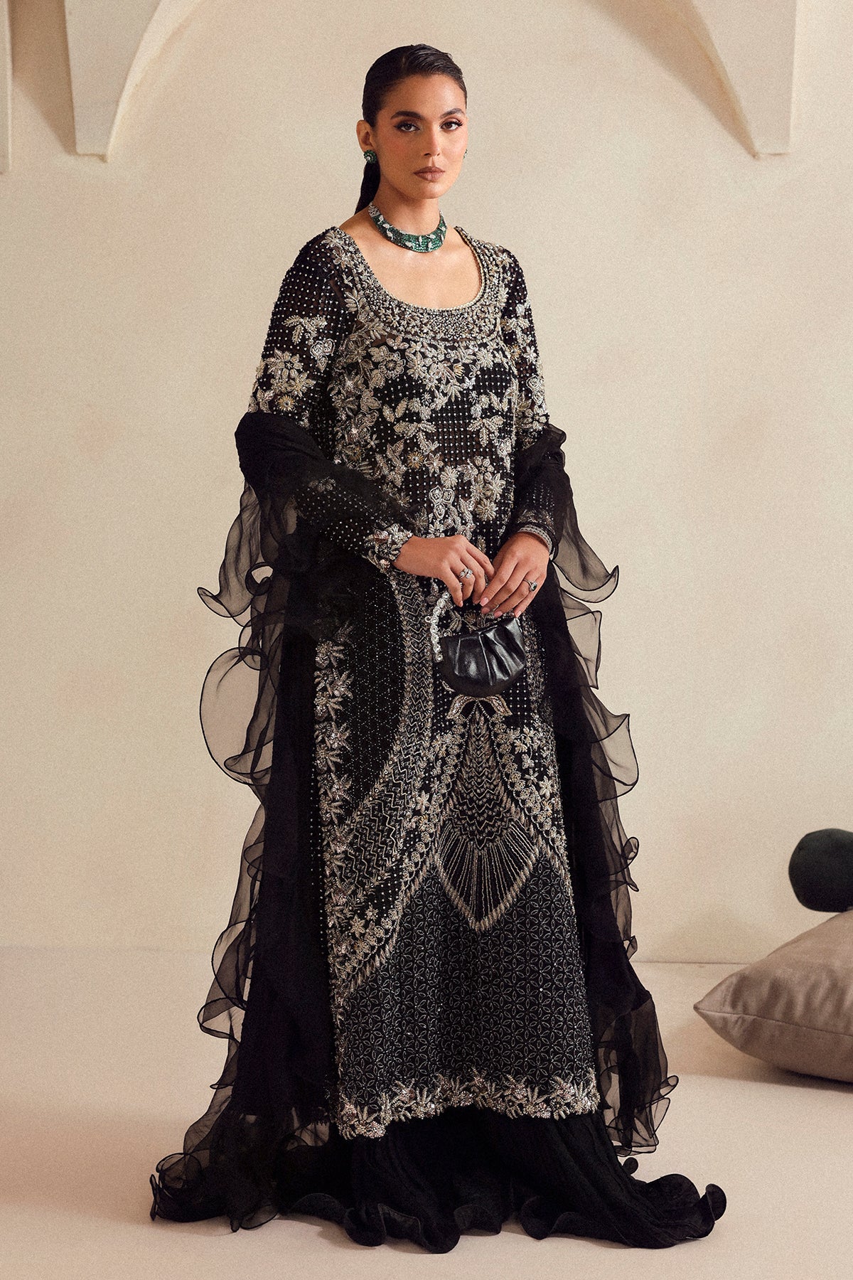 A classic black straight-cut shirt crafted for a clean and structured silhouette, paired with crushed raw silk trousers that add texture and understated depth. The contrast between the sharp tailoring and the rich fabric creates a powerful yet elegant look, perfect for formal evenings and statement festive wear with a modern edge.
