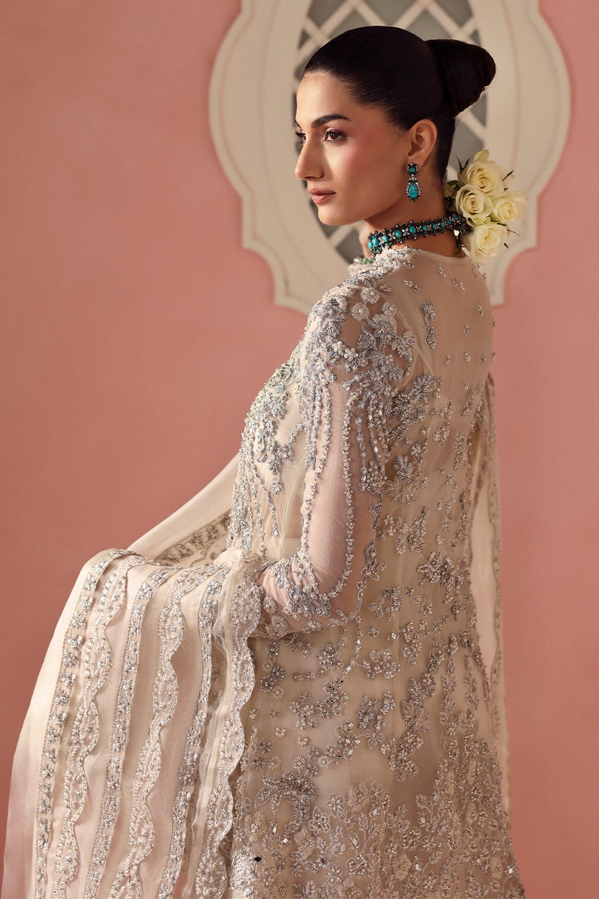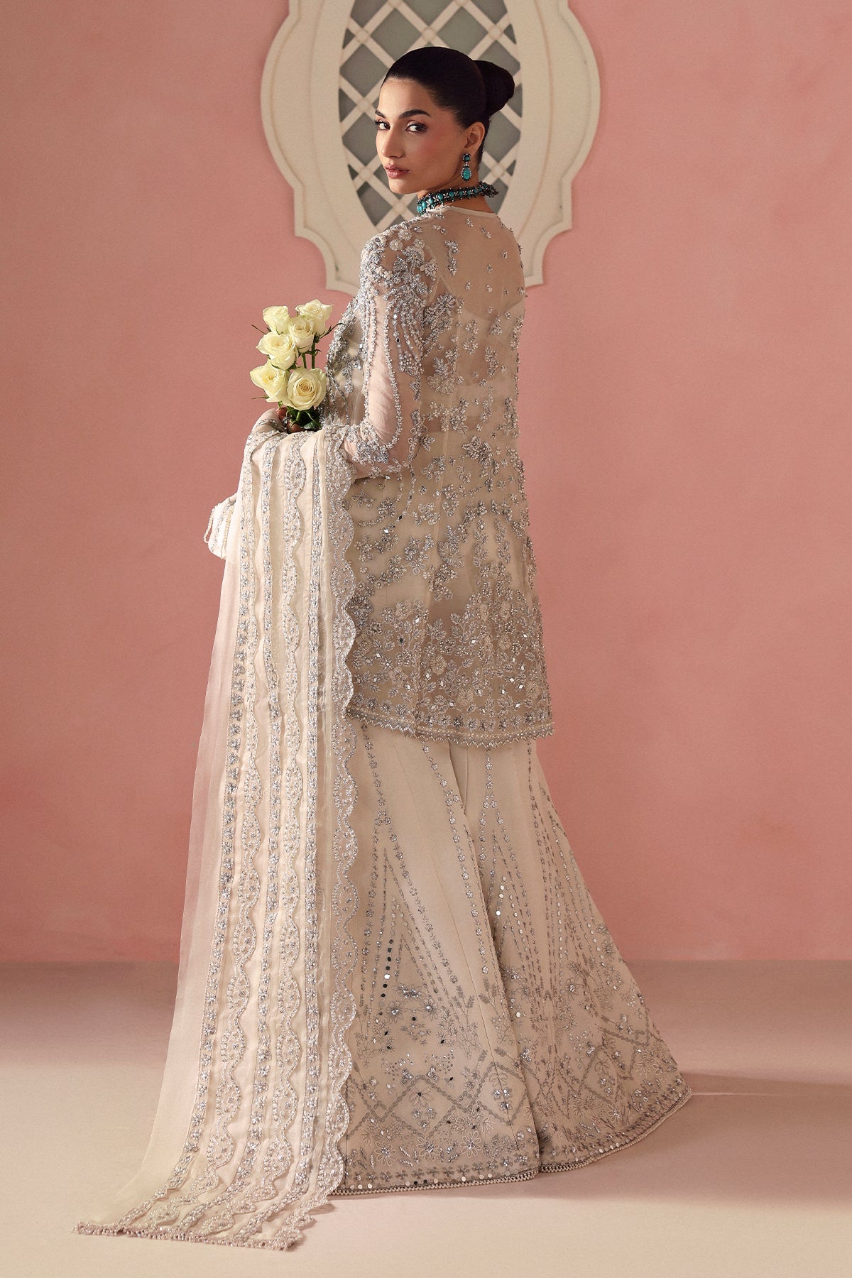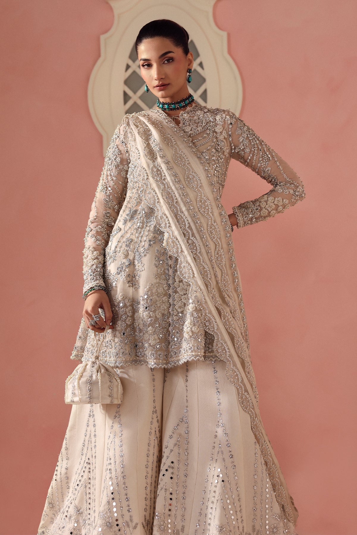 An elegant off-white peplum crafted with a sheer pure organza outer, delicately enhanced with handcrafted adda work featuring intricate mirror detailing and fine cut dana that catch the light with subtle brilliance. Paired with a rich sheesha silk sharara offering graceful movement and depth, the ensemble blends artisanal craftsmanship with modern sophistication. Perfect for festive and formal occasions, this look embodies understated luxury with a timeless appeal.