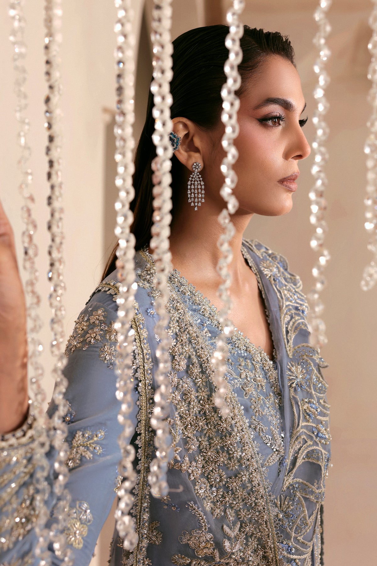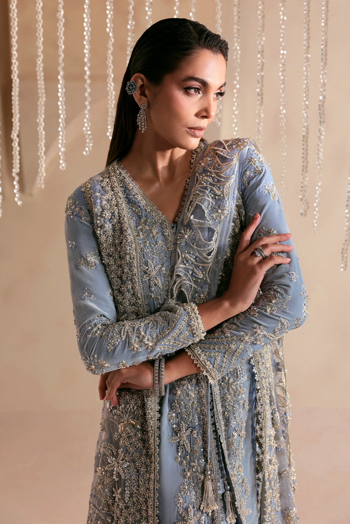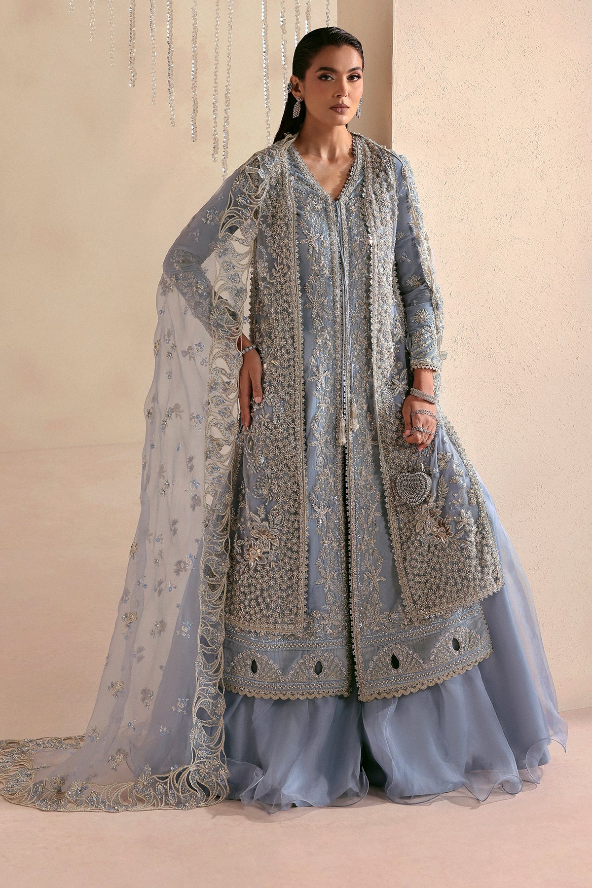 A dreamy sky-blue ensemble featuring a plush velvet inner, layered with a sheer pure organza gown that adds softness and fluid elegance. Paired with pure organza ruffled trousers that bring volume and movement, the look is elevated with delicate craftsmanship and graceful textures. Designed for statement festive and formal occasions, this outfit blends romantic femininity with contemporary sophistication.